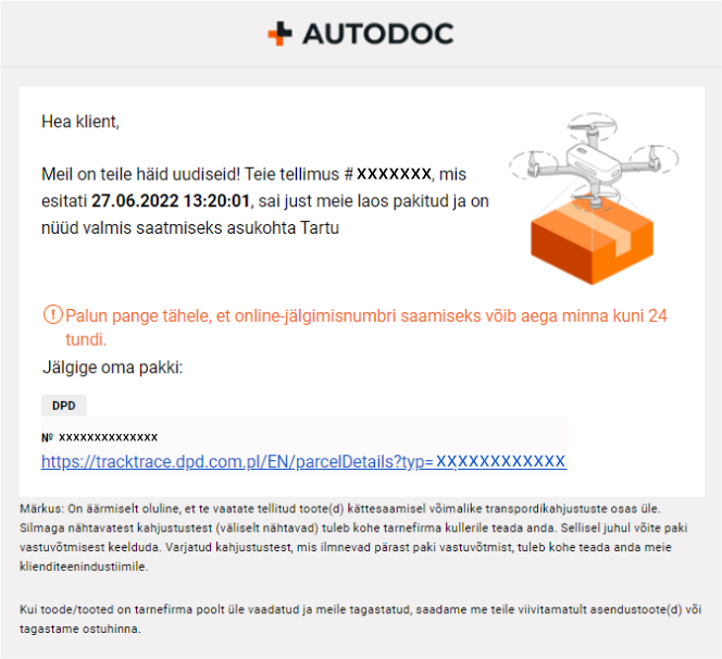 - Kui me oleme teie tellimuse pakkinud ja teele pannud, saate te jälgimisnumbriga meili. Kasutage seda oma paki asukoha jälgimiseks.